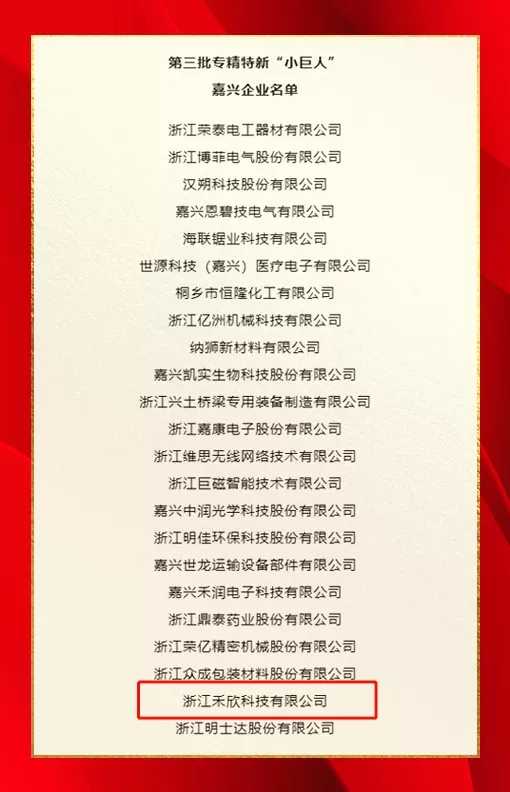 浙江禾欣科技有限公司入围第三批专精特新“小巨人”企业名单